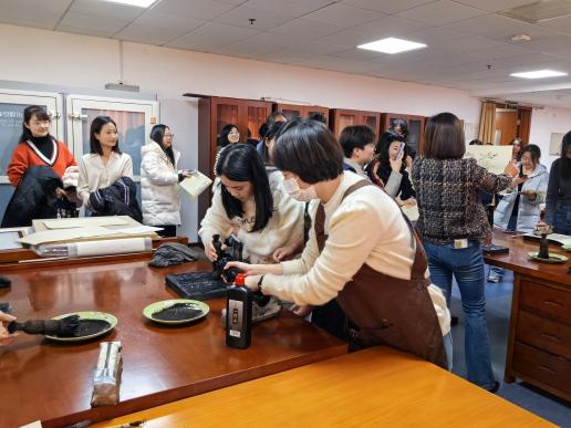 交流会后,天津中德应用技术大学师生一行进一步了解了我校图书馆文化育人的实践成果,沉浸式体验了中国传统雕版水印技艺,亲手印刷经典文献和杨柳青年画,感受传统工艺的魅力;在七楼古籍书库和古籍修复实验室,师生们参观了明清时期线装古籍,近距离观摩古籍修复师的工作场景,感受“修旧如旧”的技艺精髓;在五楼书库,师生们体验了视觉机器人盘点和检索查找图书方式;在A区一楼百部经典《诗经》系列展区,师生们开启了一场穿越时空的文化之旅。展区通过古籍展览、古典文化场景体验等单元,将《诗经》的千年风韵娓娓道来。师生们漫步其间,仿佛置身于诗意的画卷,感受着先民们的情感与智慧。